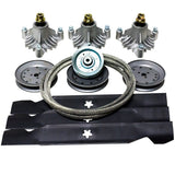 Details: Kit Includes: (3) Spindles (3) Blades (3) Pulleys (1) Idler Pulley (1) Belt Spindle Replaces OEM# AYP: 143651, 532143651 Husqvarna: 143651, 532143651 Spindle Fits Models: AYP: 44" and 50" ventilated deck Spindle Specifications: Height: 4 7/8" Specially designed: to replace 5 pt. star spindle shaft Blade Replaces OEM# AYP/ROPER/SEARS: 137380, 532137380 Blade Specifications: LENGTH 17-3/8" WIDTH 2-1/4" C. H. DIA 5 POINT STAR THICKNESS 0.1600" CUT DIRECTION RIGHT Pulley Replaces OEM# AYP/ROPER/SEARS: 129861, 153535, 173436, 177865, 532173436 HUSQVARNA: 532 12 98-61, 532 17 34-36, 532153535 Pulley Specifications: ID 5/8" OD 5-3/16" WIDTH 7/8" Idler Pulley Replaces OEM# AYP: 104360X, 131494, 173438 Husqvarna: 532131494, 532173438 John Deere: AM103480, AM37321 Idler Pulley Specifications: Height: 1 1/8" ID: 3/8" OD: 3 7/8" Material: Metal Belt Replaces OEM# Ariens: 21547082, 21547188 AYP: 144959, 532144959 Craftsman: 24690 Husqvarna: 531300766, 532144959, McCulloch: 532 14 49-59 Belt Specifications: Belt Application: Deck Belt Type: Covered Width: 1/2" Length: 95 1/2"