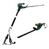 This Corded 2 in 1 pole and portable hedge trimmer is a powerful and reliable tool which provides very good service for trimming hedges, shrubs and bushes. The pole hedge trimmer extends to over 9 feet long, and easily converts to a hand held trimmer to save money on garden maintenance. Its Counter-rotating and dual-edge trimming blade lets you cut on right or left side of the hedge trimmer for easy shaping and sculpting with less vibration. 20-inch-cutting length and 3/4 inch cutting capacity laser cutting blade with rust-resistant hardened steel for cleanly, smoothly and quickly cutting. For efficient power transmission there is a robust metal gearing with a long service life. Aluminum telescopic tube for more stable and professional using.