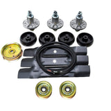 - Kit Includes: (3) Spindles (3) Blades (1) Belt (2) Pulley (1) Idler Pulley (4) Deck Wheels.