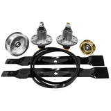 Details: Kit Includes: (2) Spindles (2) Blades (1) Belt (1) Pulley (1) Idler Pulley Spindle Replaces OEM# John Deere: GY20454, GY20867, GY20962, GY21098 Spindle Fits Models: John Deere: D100-D160, LA100-LA165, X110, X120 and X140 Spindle Specifications: OD: 5" Height: 7" Specially Designed: To replaces 7 pt star spindle shaft Blade Replaces OEM# John Deere: GX22151, GY20850 Windsor: 50-3231 Blade Fits Models: John Deere: D100, D100, D105, D110, D110, D120, D120D, D130, D130, LA100, LA100, LA105, LA105, LA110, LA110, LA115, LA115, LA120, LA120, LA125, LA135, LA135, X110, X110, X120, X120, X125, X145, Z225, 102, 102, 105, 115, 115, 125, 125, 135, 135, 2 for 42" Blade Specifications: LENGTH 21-3/8" WIDTH 2-3/4" C. H. DIA 7 THICKNESS 0.1550 Belt Replaces OEM# John Deere: GX20072, GY20570 Belt Fits Models: John Deere: D100-D130, L100 and L125 Belt Specifications: Belt Application: Engine to deck Belt Type: Covered Width: 1/2" Length: 104" Pulley Replaces OEM# John Deere: GY20629, GY20110 Pulley Replaces OEM# John Deere: GY22172, GY20067